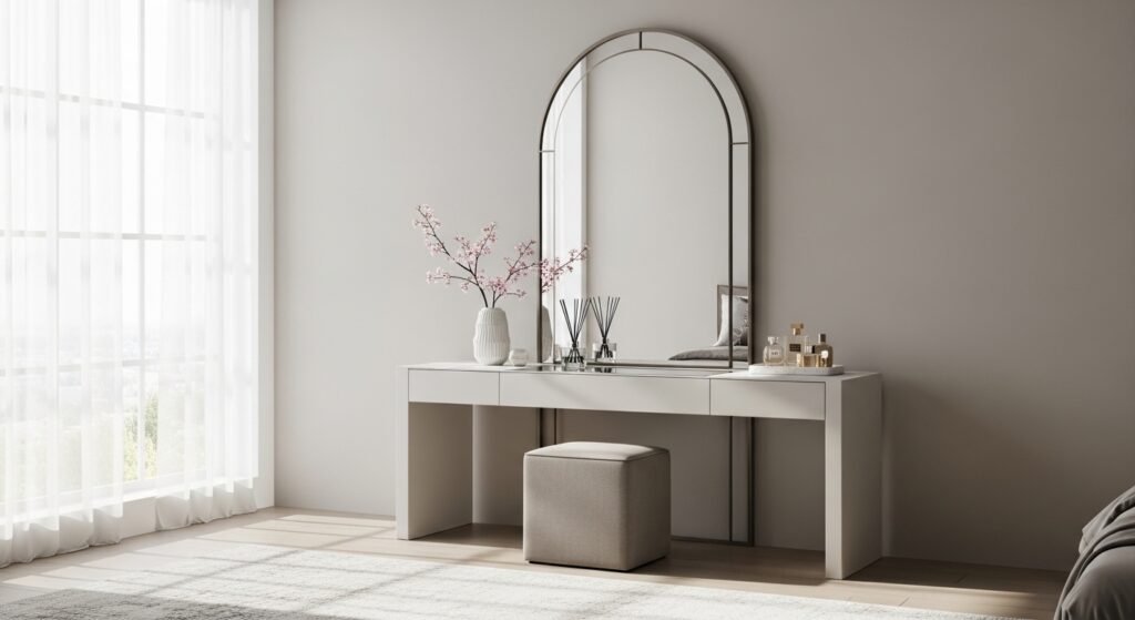 A simple white vanity table with slim legs instantly makes a room feel lighter. Think matte finishes, a frameless mirror, and just a few essentials placed neatly on top. Maybe a small ceramic tray, your daily skincare, and a soft linen stool tucked underneath. It works especially well in smaller spaces because it doesn’t overwhelm the room. And honestly, the clean look makes mornings feel calmer. It’s the kind of setup that looks effortless, even when everything isn’t perfectly arranged.