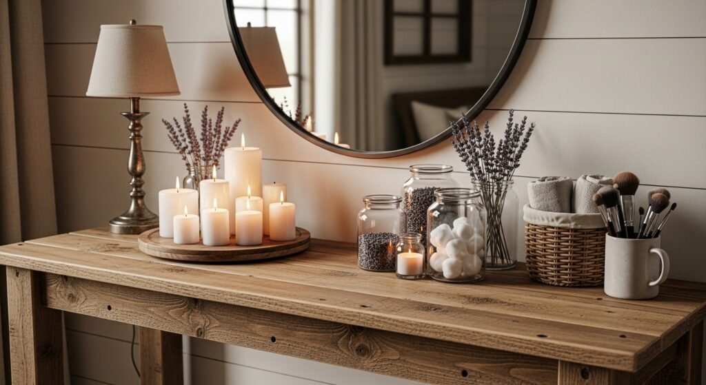 A rustic vanity brings in that cozy farmhouse feel with its slightly rough edges and natural wood tones. It looks great paired with a simple mirror, maybe even one with a black metal frame. Add a soft fabric stool or a wooden chair. You can decorate it with small jars, candles, or even a tiny basket. It feels warm and lived-in, not overly styled. Perfect if you like spaces that feel a bit grounded and real.
