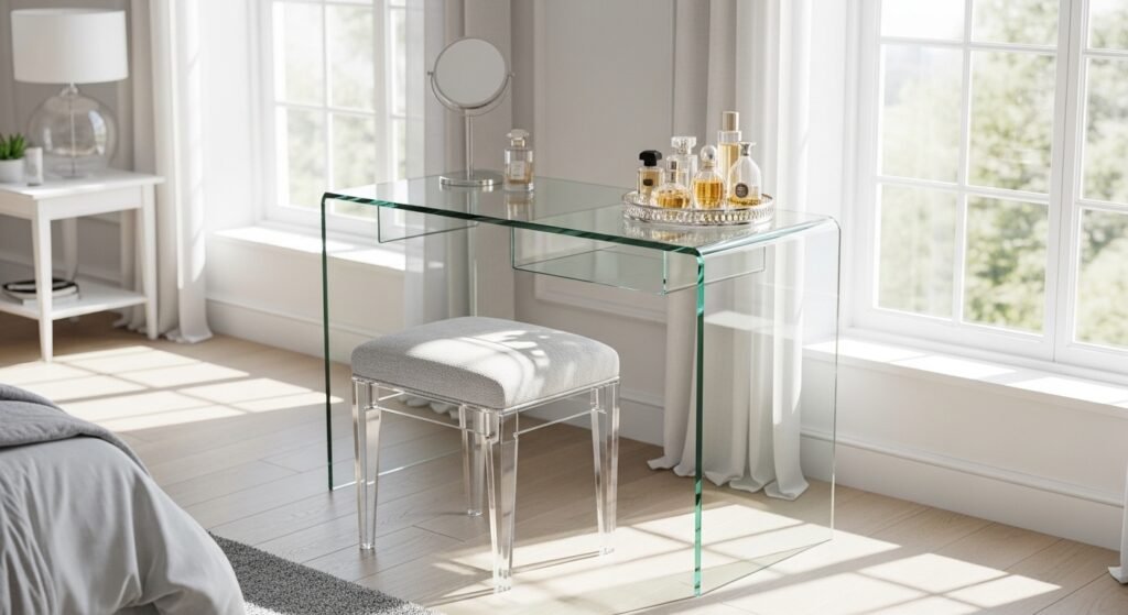 A glass vanity table almost disappears into the room, which is why it works so well in smaller spaces. The transparency keeps everything looking open and uncluttered. Pair it with a soft upholstered stool to balance the look. You can add a few delicate items on top, like a perfume bottle or a small tray. It doesn’t need much. The simplicity is what makes it feel elegant without trying too hard.