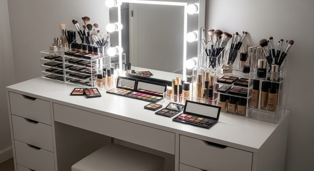 If you have a lot of makeup, acrylic organizers can make everything look tidy without hiding it. A simple table works best here so the focus stays on the setup. Arrange products by type or color—it actually looks quite satisfying. Add a mirror with good lighting and maybe a small stool. It’s functional, but also kind of pretty in its own way. Everything has its place, which makes the whole routine feel smoother.