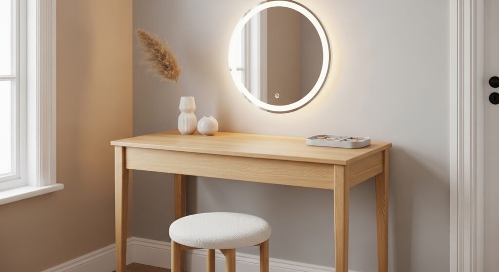 Lighting changes everything when it comes to a vanity table. A mirror with built-in lights not only looks sleek but also makes getting ready easier. Go for soft white lighting so it doesn’t feel harsh. Keep the table surface clean with just a few essentials. Maybe add acrylic organizers to keep things neat. It leans slightly modern but still works in most rooms. And honestly, it just makes the whole space feel more intentional.