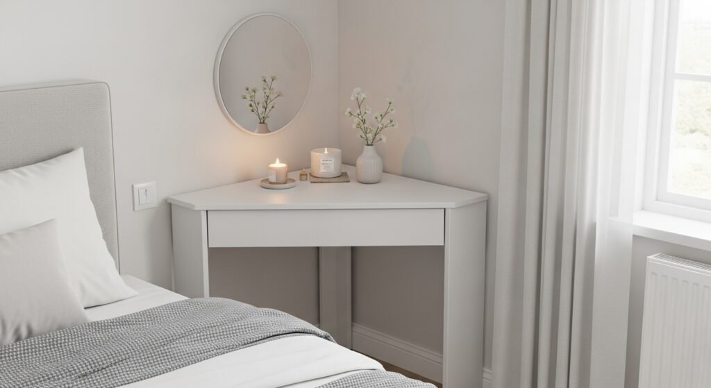 Sometimes the only free spot is a corner, and that’s honestly enough. A corner vanity table can fit neatly without making the room feel crowded. Use a triangular or compact design and add a wall-mounted mirror above it. Light colors help keep it from looking heavy. A small drawer or basket underneath is useful for storage. It’s practical, but it can still look really pretty with just a candle or a tiny vase placed on top.